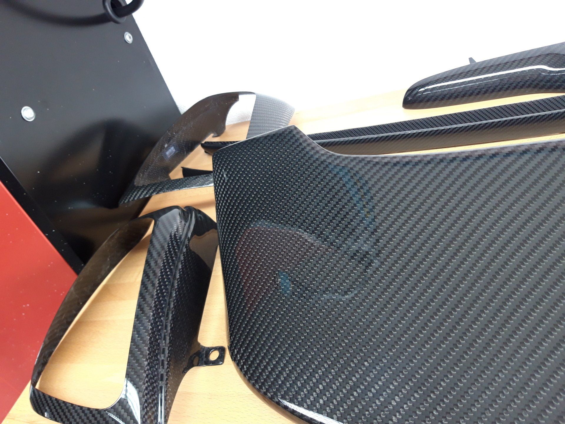 Standardmäßig verwenden wir sogenanntes 245g/m² Köpergewebe und polieren den Klarlacküberzug auf Hochglanz. Bearbeitet werden können sowohl Bauteile des Interieur wie auch des Exterieur. Die Veredelung erfolgt individuell von Hand und hat eine Bearbeitungszeit von ca. 4 Wochen.